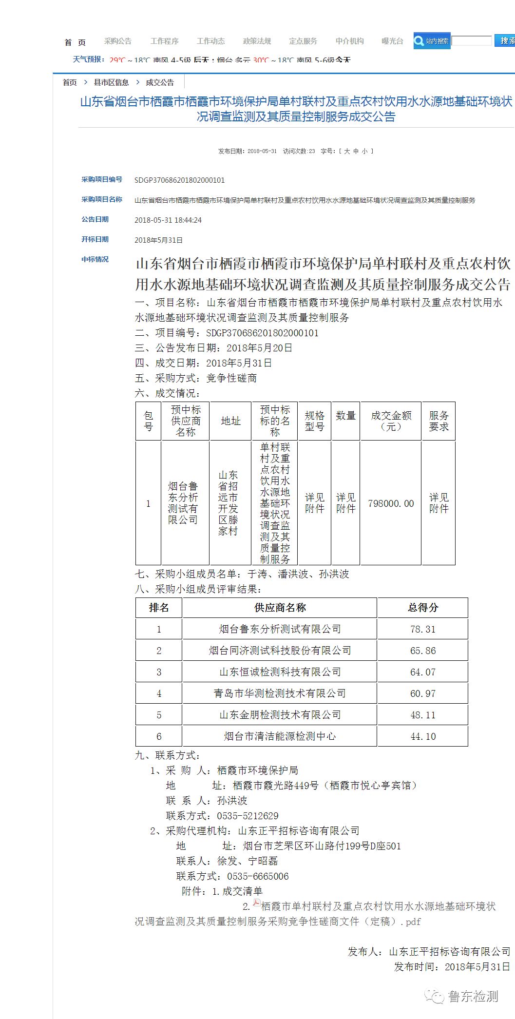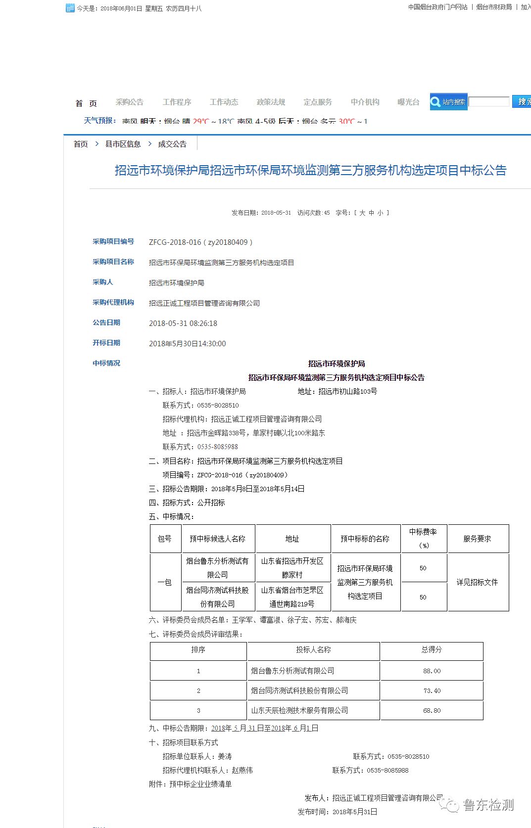烟台鲁东分析测试有限公司成立于2004年,在环境检测方面有多年的工作经验,凭借这一优势和公司过硬的综合实力,我司于2018年5月30日中标“招远市环境保护局招远市环保局环境监测第三方服务机构选定项目”;于2018年5月31日连续中标“山东省烟台市栖霞市环境保护局单村联村及重点农村饮用水水源地基础环境状况调查及其质量控制服务”项目。接连两次中标,这是对我司极大的肯定,也是公司未来更大的发展动力。“诚信、共赢”始终是鲁东的合作理念,我们会以更加严谨、负责的态度做好化验工作,完满完成任务,在公司领导的带领下迈入新的台阶。